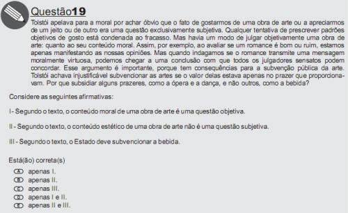 A alternativa III diz que, segundo o texto, o estado deve subvencionar a bebida. O texto não diz isso. Ele diz apenas que Tolstói achava absurdo justificar o subsídio a algo apenas pelo fato de proporcionar prazer a alguém. Se esse o prazer fosse o único valor da arte, diz o texto, o subsídio a ela não seria justificável (tanto quanto não é justificável subsidiar a bebida). Portanto, III está errada.