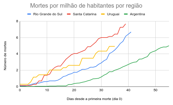Registro do número de mortes por milhão de habitantes no Rio Grande do Sul e regiões vizinhas com dados alinhados a partir do registro da primeira mote em 04/05/2020 (fonte)