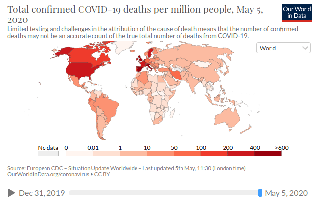 Mortes totais por milhão de habitantes em vários países do mundo (em 05/05/2020, fonte)